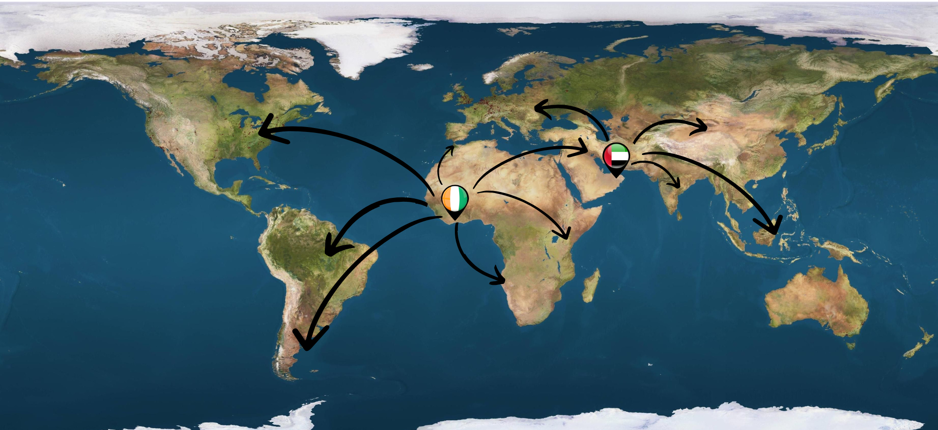 Nossa presença estratégica em Dubai e na Costa do Marfim nos posiciona na interseção dos fluxos comerciais globais e da produção primária. A infraestrutura de classe mundial de Dubai, o ambiente de negócios com eficiência fiscal e a posição como um importante centro de reexportação proporcionam aos nossos clientes um acesso inigualável ao mercado. A sofisticada rede logística do emirado, que abrange seus portos ultramodernos e o aeroporto mais movimentado da região, nos permite conectar com eficiência os mercados asiáticos, europeus e africanos. Essa localização estratégica, combinada com as regulamentações favoráveis aos negócios e o ecossistema comercial estabelecido de Dubai, nos capacita a otimizar as cadeias de suprimentos e oferecer valor superior aos nossos parceiros em todo o mundo.